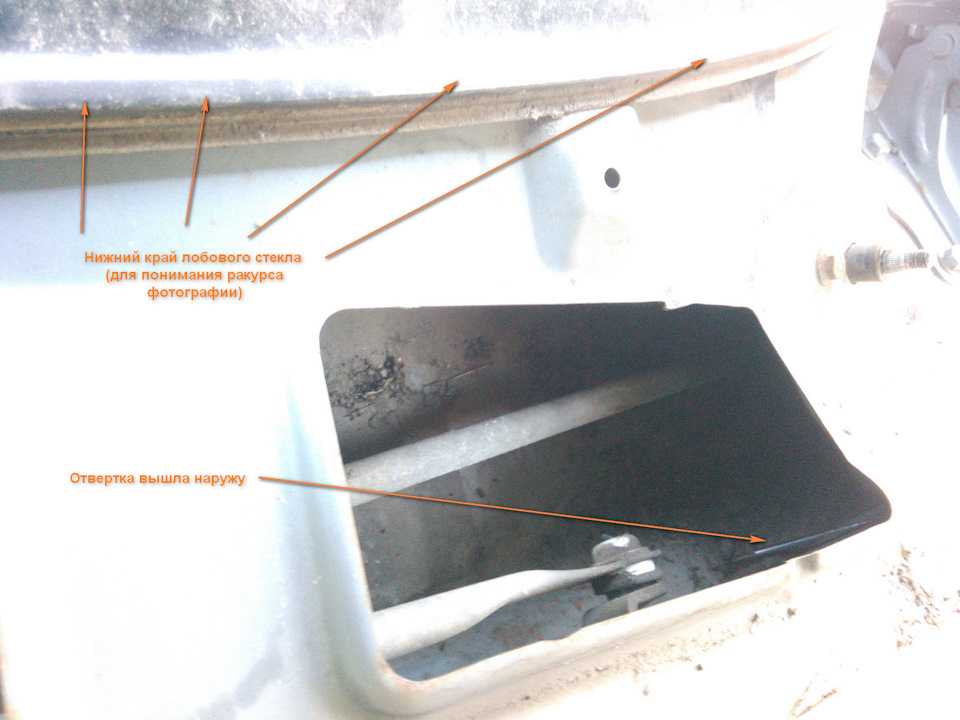 Осталось найти где она вылезет снаружи. Снимаю пластиковые накладки над дренажом (между лобовым стеклом и кромкой капота) и вуаля: