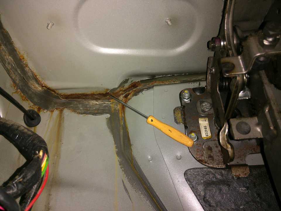 Проблемка встречается регулярно, насколько я заметил…После дождя или мойки под ковролином появляется лужа, под ногами чего-то начинает почавкивать ((У меня с обеих сторон: у пассажира и водителя (в большей степени). Иногда оно дает запашок, если не успевает высохнуть, или просто потеют окна в большей степени, чем у припаркованных рядом машин. Все это дело отлично «подогревается» заводской поролоновой шумоизоляцией, активно впитывающей воду. Заметил я воду когда полез к ЭБУ.Затем сорвал шумоизоляцию (насколько можно было дотянутся вверх за торпедой) и мне открылись ржавенькие места на швах под заводским герметиком.Поливать водой снаружи и искать место течи не пришлось. Достаточно было тщательнее отковырнуть отлетающий герметик на шве изнутри. И что я увидел? «Опаньки, свет в тоннеле!».Отвертка прошла туда легко ((