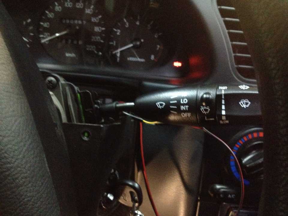 Соединяем кольцо переключателя дворников с маленькими контактами на реле. Один провод я подключил к существующей проводке, а второй добавил к новому контакту на реле с помощью маленькой «мамы».