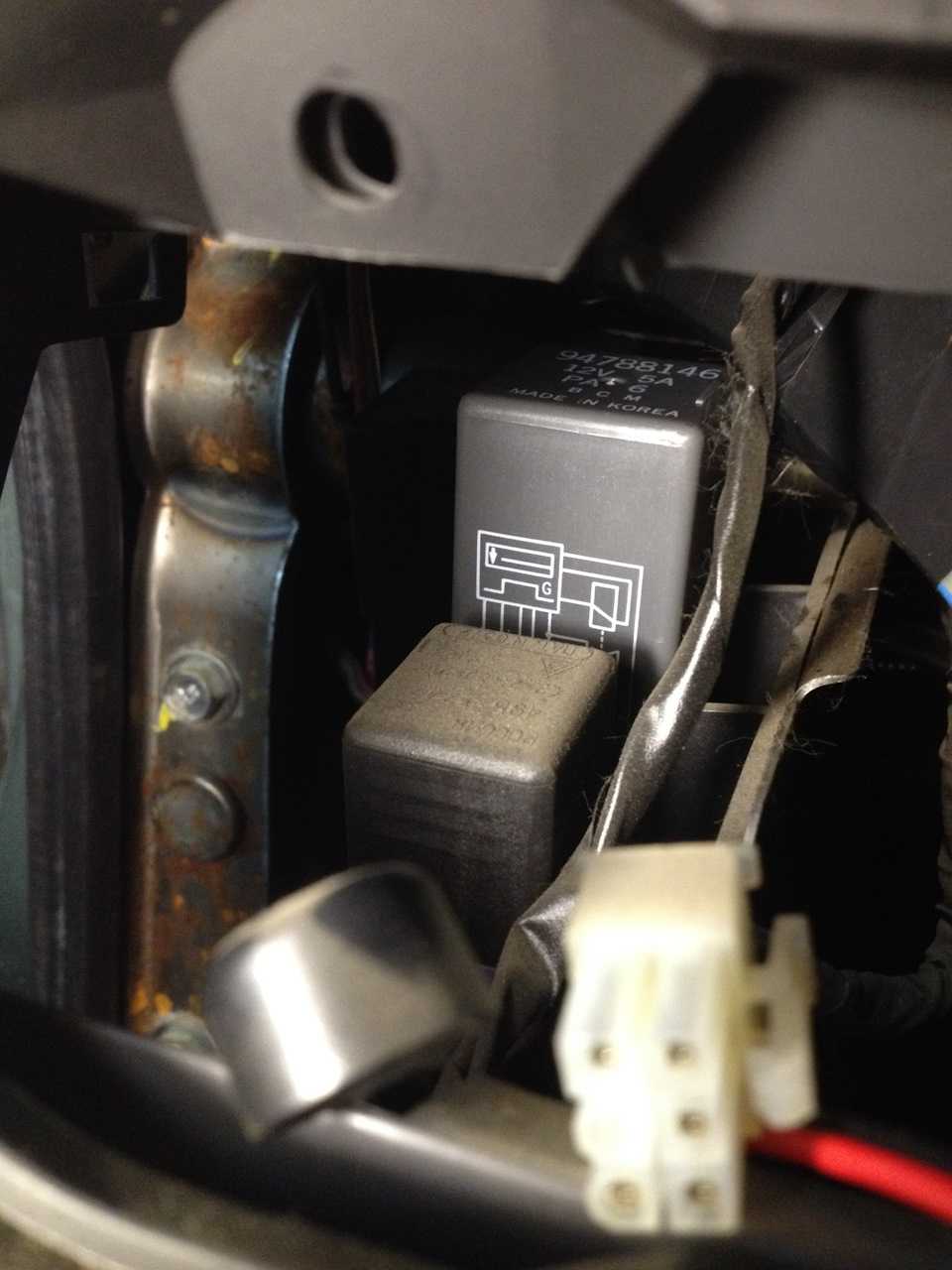 Далее с левой стороны, под корректором фар, снимаем старое реле дворников. Оно 6 контактное. И ставим новое реле с Daewoo Nexia 7 контактное.