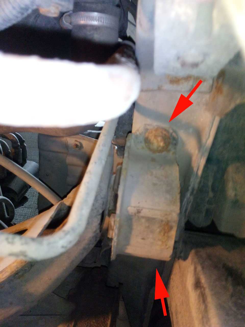 В процессе поднятия ДВС важно следить за радиатором и кожухом вентилятора.Для крепления опор к раме используются сквозные болты. После удаления болтов демонтаж старой подушки не представит никаких сложностей.