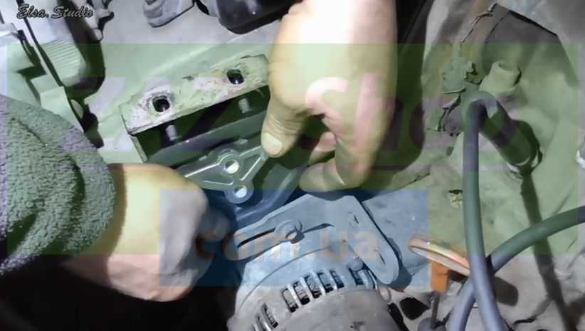 - Автор видео дополнительно снимал и кронштейн натяжителя. Этого можно не делать, если не планируется отодвигать генератор. Манипуляции с положением генератора можно заменить спуском/подъемом двигателя при помощи домкрата .