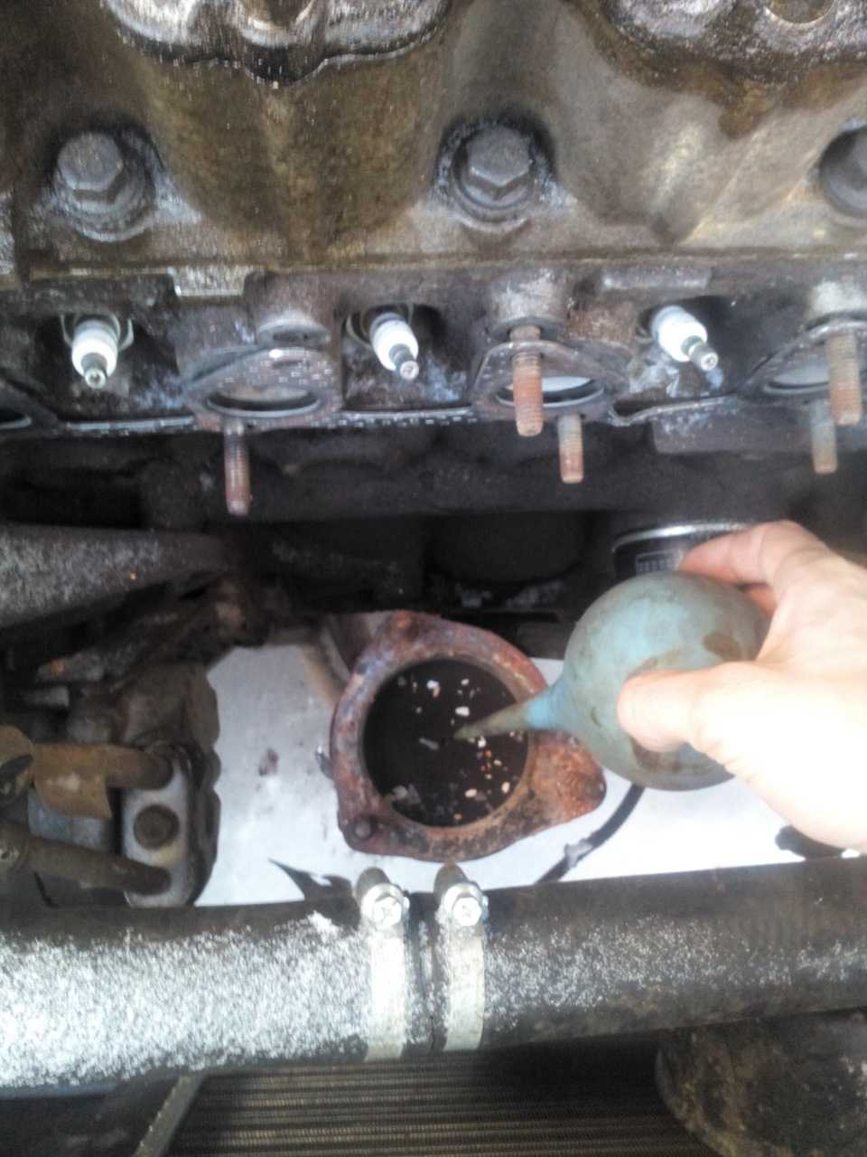 - Аккуратно укладываем головку на место, предварительно откачав масло из колодцев с резьбой под болты шприцем. Сделать это нужно обязательно, поскольку остатки масла могут разрушить блок цилиндров. Масло несжимаемое.