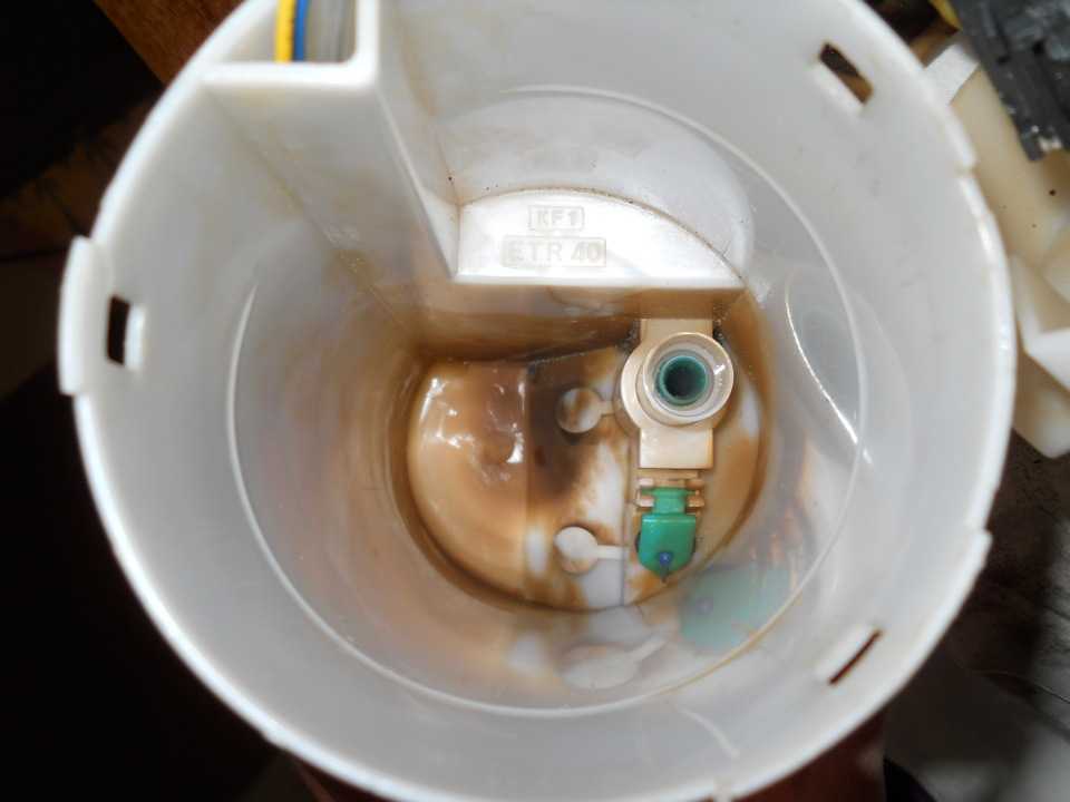 Далее вынимаем сам насос, немного загнув верхнюю железную часть — она на пружине, ничего страшного не будет. В насосе полно топлива, так что нужно его аккуратно слить обратно, перевернув «вверх тормашками». Будьте аккуратны.