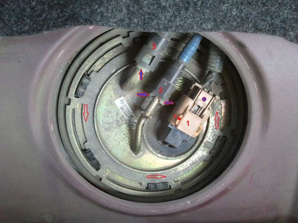 Все тщательно продуваем и протираем, дабы грязь не попала в бак после снятия насоса. Отключаем колодку проводов (1), и топливные трубопроводы (2 и 3)Чтобы снять, колодку проводов, нужно оранжевый фиксатор, помеченный точкой, немного выдвинуть, как показано стрелкой, то есть к трубопроводам. Синей точкой показано куда нужно нажать, чтобы вытащить колодку.Чтобы снять шланги, нужно нажать на белые фиксаторы.