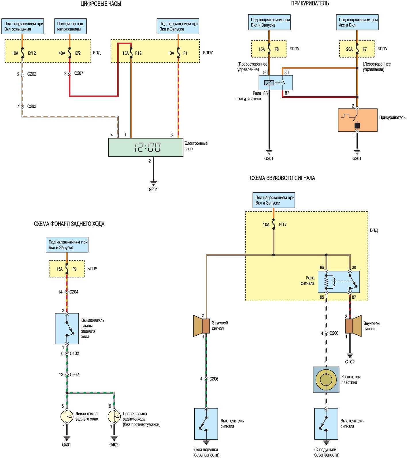33. Обогрев стекла двери задка авто и схема прикуривателя и часов: