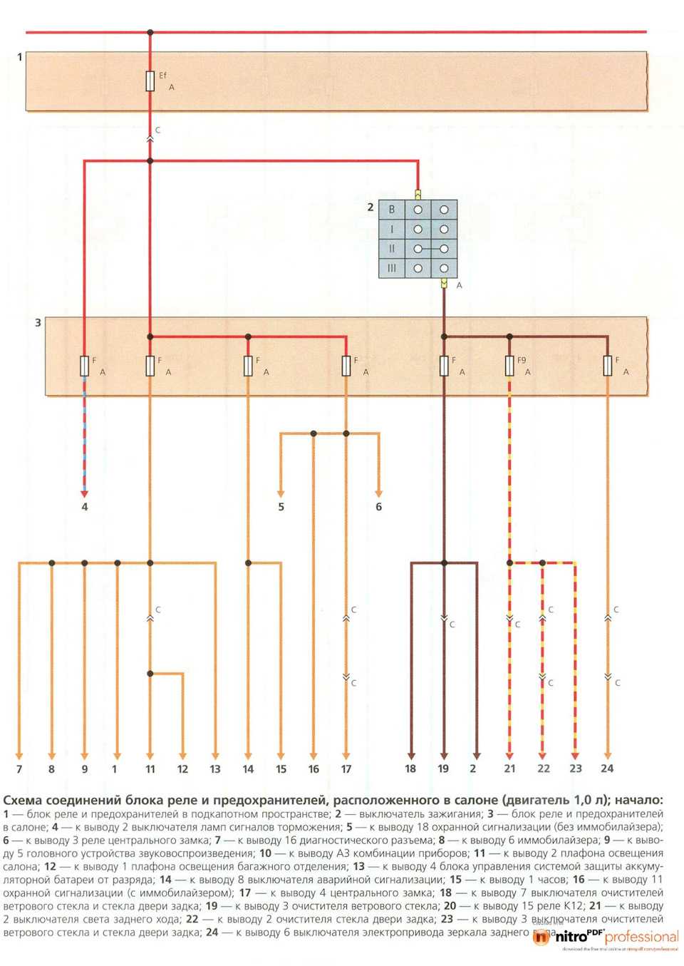 12. Соединения блока реле и предохранителей, расположенного под капотом автомобиля (двигатель 1.0 л):