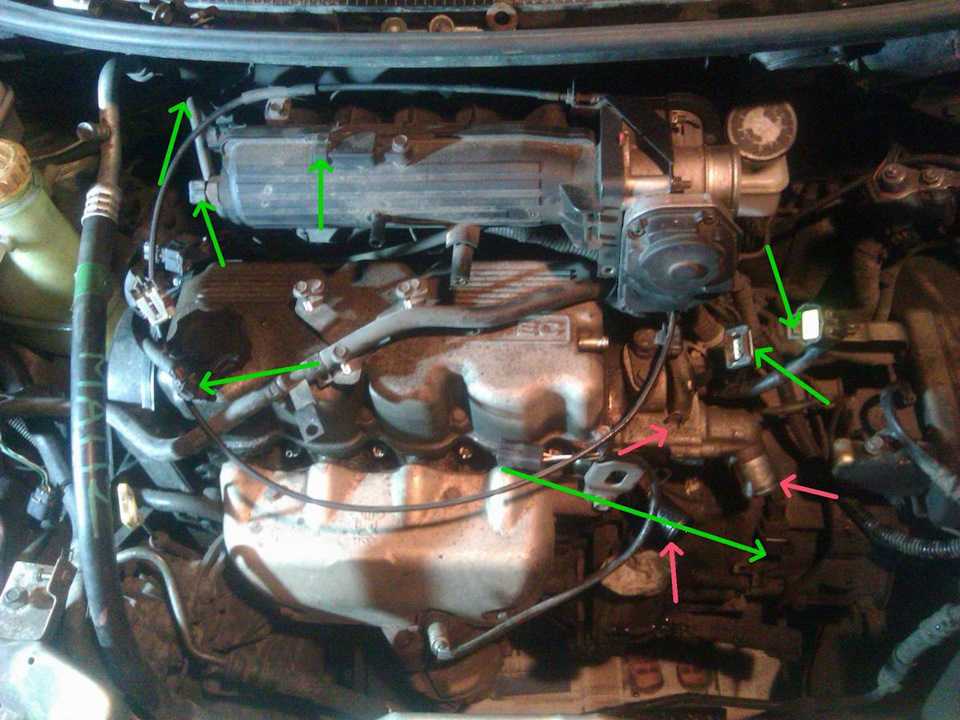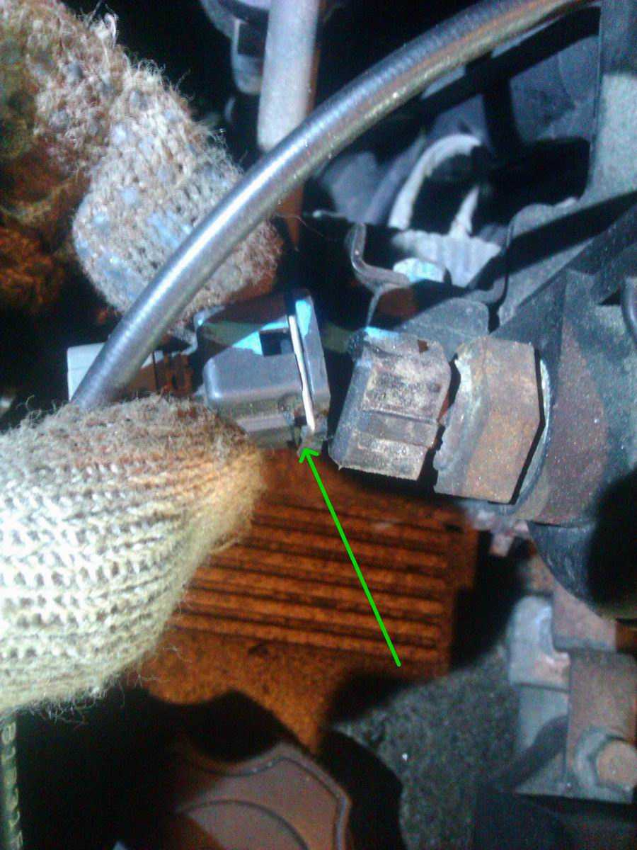 Потом пошла электрика. Все соединители имеют фиксатор, на который надо нажать. Иногда он проволочный, как на форсунках, иногда пластиковый. На пластиковый лучше нажимать предварительно сжав части разъема друг к другу.
