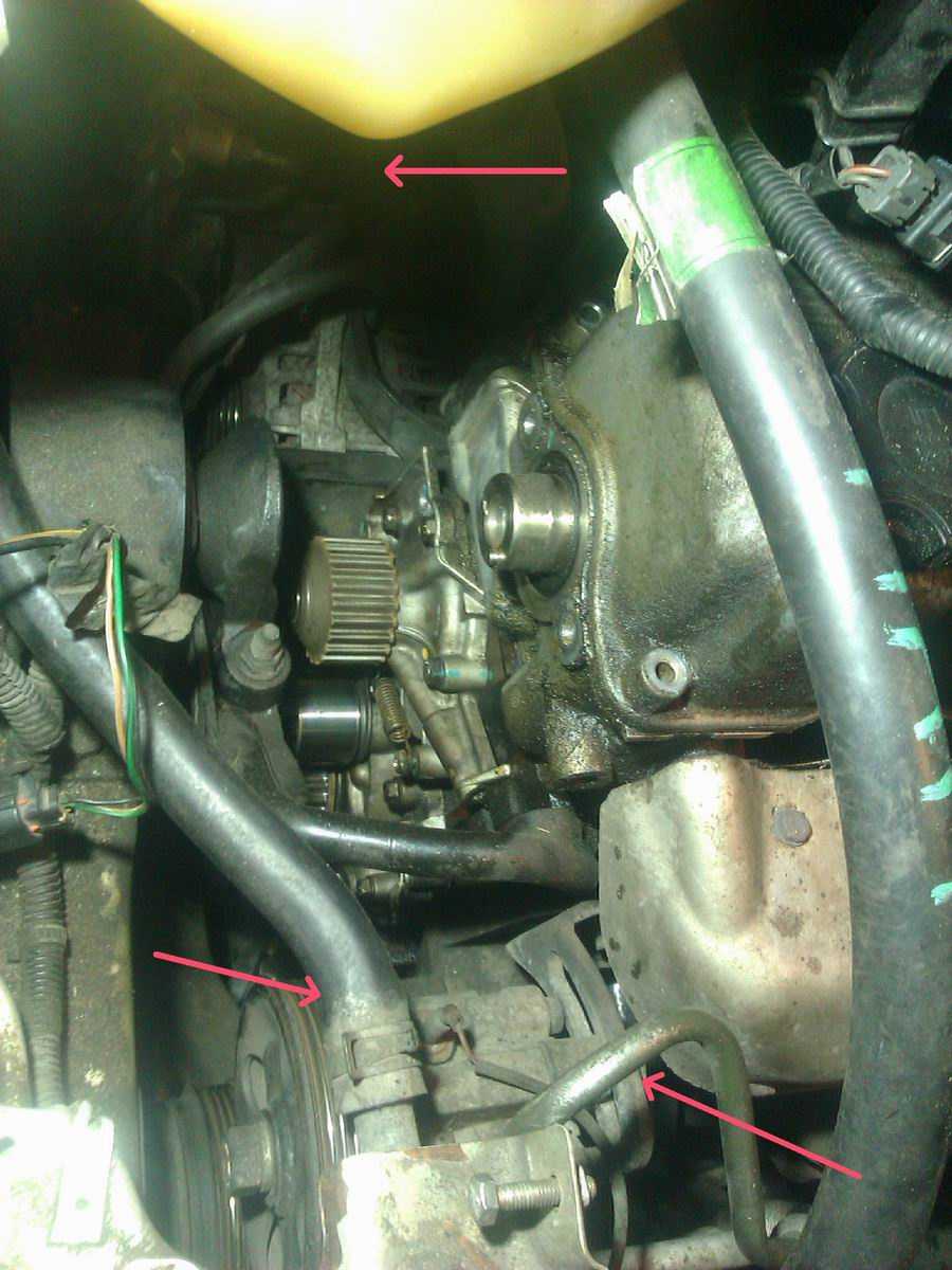 Снял крышки и ремень ГРМ. Про снятие крышек и отворачивание болтов и болтиков я уже писал в записи Замена ГРМКрасными стрелками отмечены болты регулировки натяжения ремней ГУР и генератора.Тряпочкой заткнуто отверстие трубки маслощупа. Там резиновое колечко еще где-то должно быть.