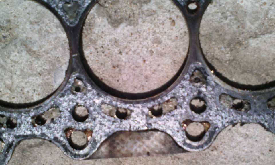 Приступаем к осмотру.Прокладку немного «попортил» около втулки, пока крутил ГБЦ вокруг второй втулки. ))В прокладке есть места, где нет отверстий для охлаждающей жидкости совсем, есть где вместо овального отверстия только круглое. На фото видны следы и отверстия. Стрелками отметил. На заводской прокладке и на купленной сейчас все совпадает. Красным отметил напорную масломагистраль, там медное колечко.Ну и место прогара в первом цилиндре.