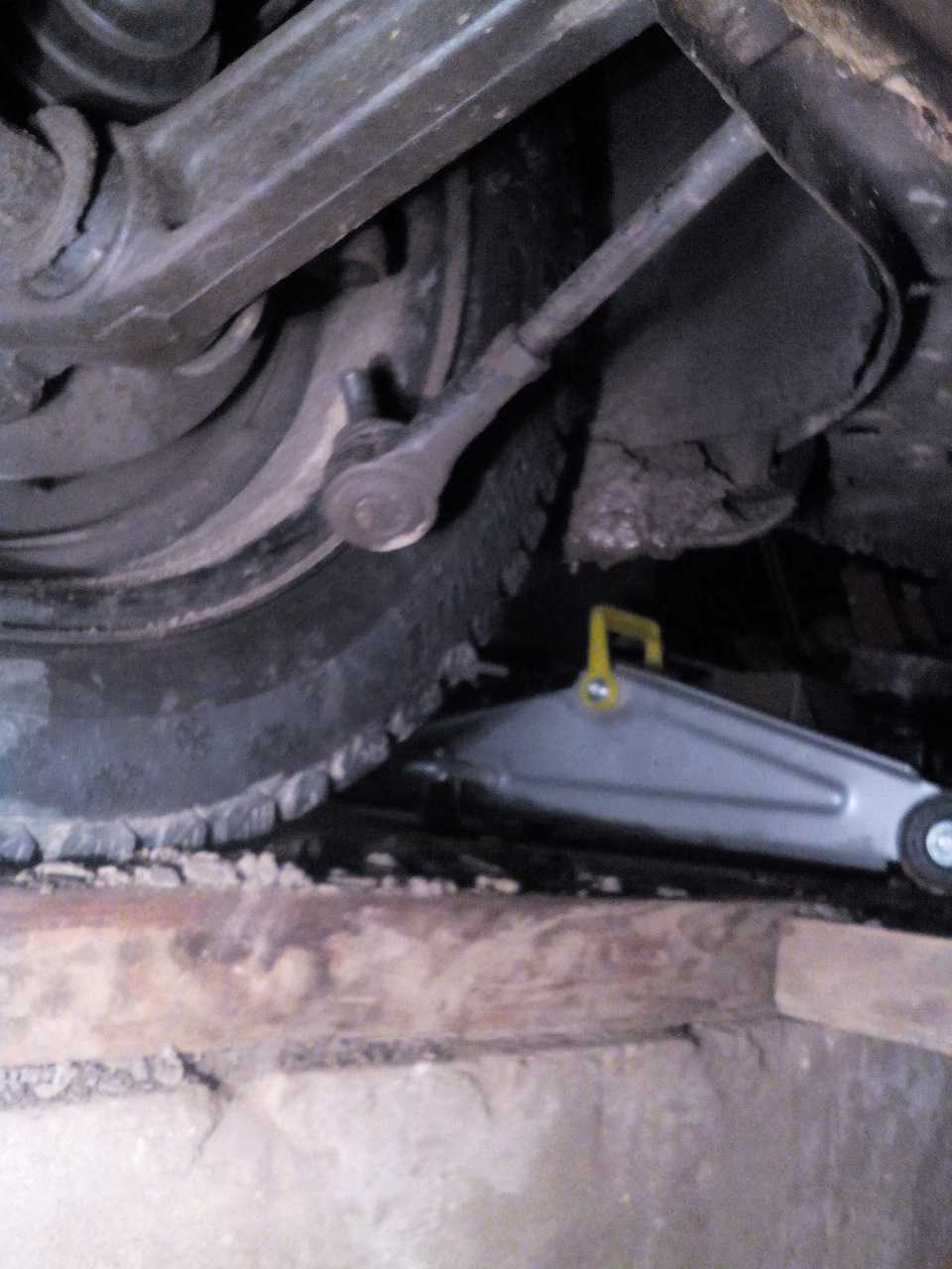 Приподнял машину при помощи двух домкратов с обоих сторон, колеса без труда поворачиваются. Теперь сливаем жидкость.