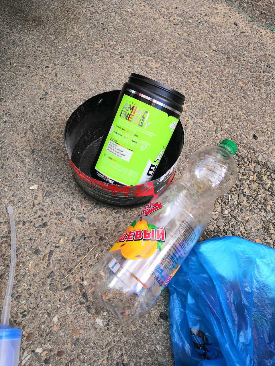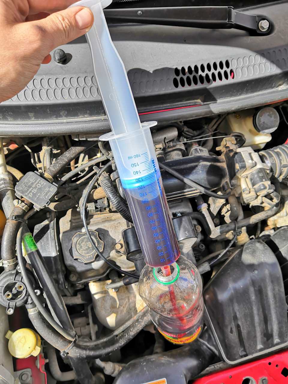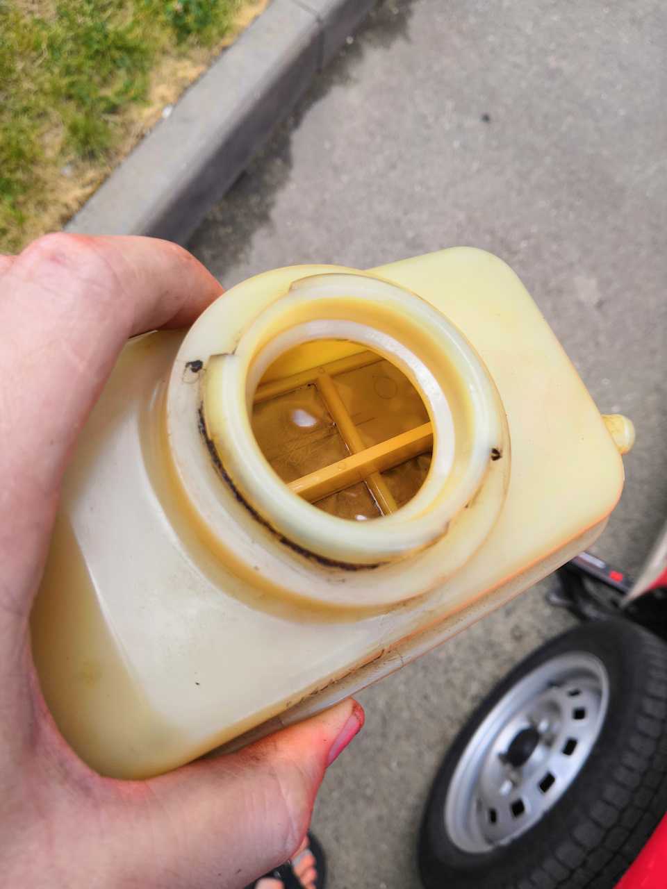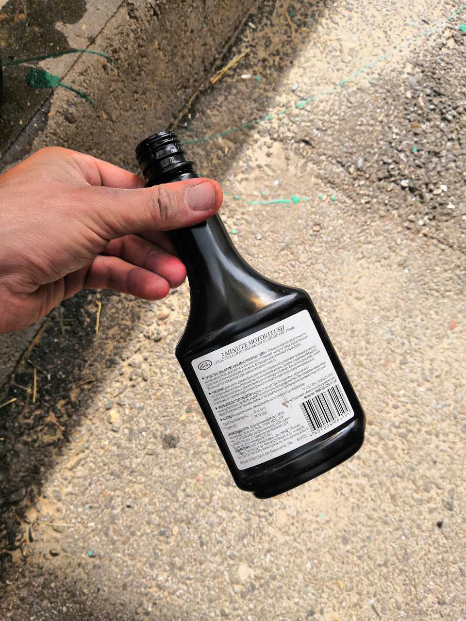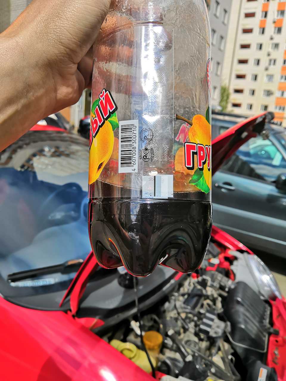 Теперь находим подходящую бутылку, чтобы можно было туда вставить шланг «обратки» и при этом расположить все это в тесном пространстве. Так как я недавно менял в двигателе масло, у меня осталась бутылка от промывки.