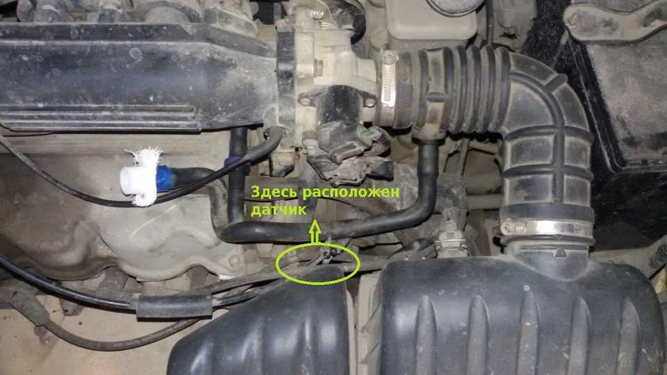 Замена этого датчика — дело совсем не сложное. Снимается корпус воздушного фильтра, и датчик вот он. Он вкручен в термостат, поэтому достать его и вкрутить новый нужно очень быстро во избежание потерь антифриза, которые по-любому будут. Поэтому небольшой запас антифриза должен быть всё таки под рукой.