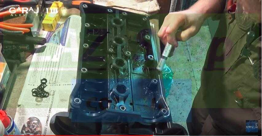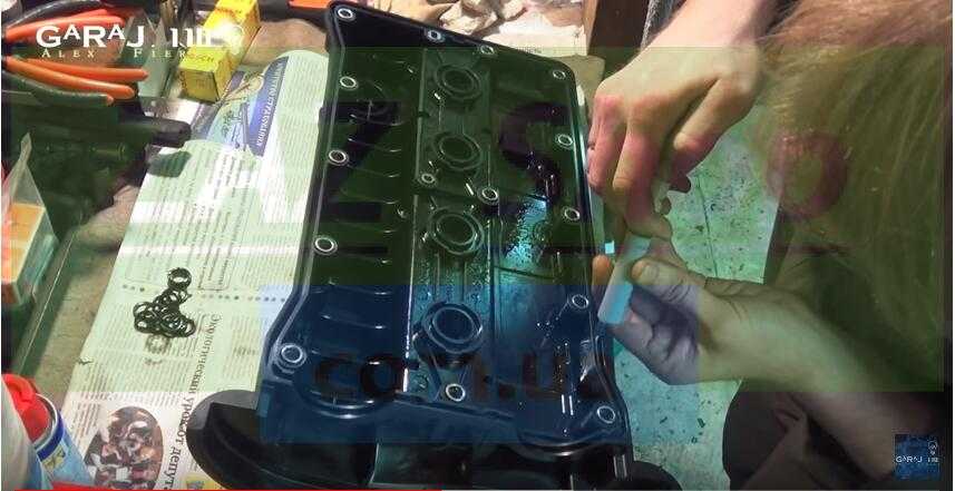 - Дальше, переворачиваем крышку и с помощью заправленного ранее шприца аккуратно наносим в пазы установки прокладки герметик.
