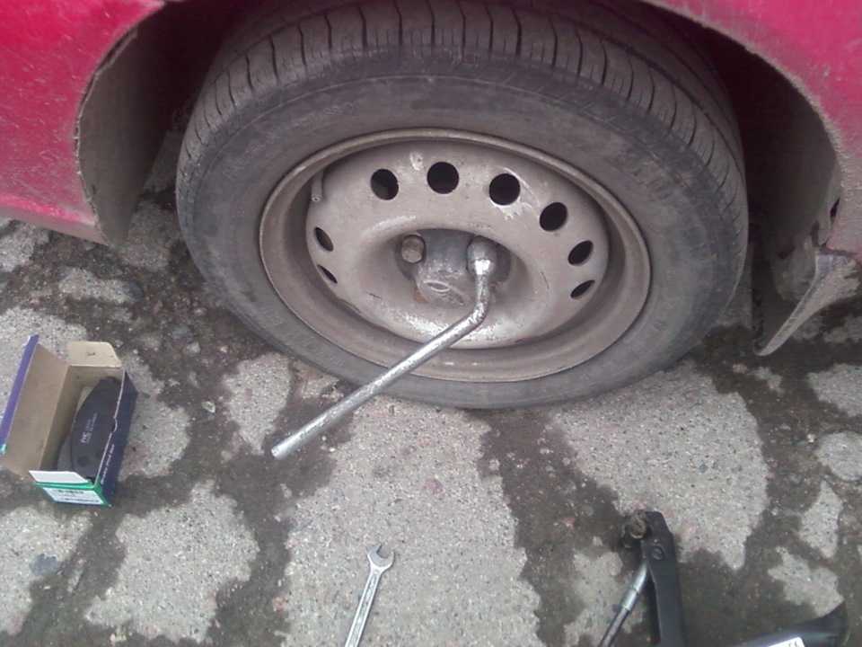 2. Вывесьте левую переднюю часть автомобиля и снимите колесо. Для этого нужно отвернуть балонным ключом и снять болты колеса.