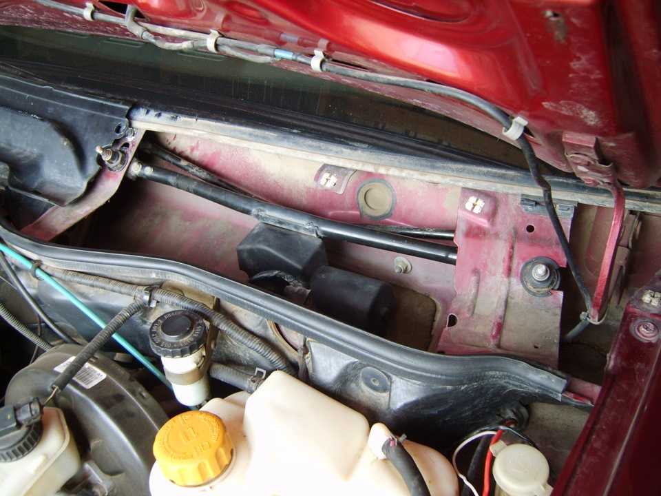 Выкрутите пару винтов по сторонам опоры капота. Снимите жабо.
