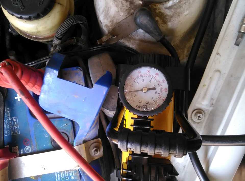 Продолжаем:Делая выводы из прошлой записи и комментариев к ней, на сегодня запланировал все же добить уже систему охлаждения (далее СО) до победного конца.Первым делом решено проверить крышки расширительного бачка. Для этого требовалось как-то загонять давление в бачок. Я решил идти по такому пути: отсоединяем тонкий шланг от расширительного, который идет к радиатору. Закупориваем его, я это сделал подходящим по диаметру болтом и хотутом. В освободившийся выход расширительного натягиваем компрессор. Получается примерно так: