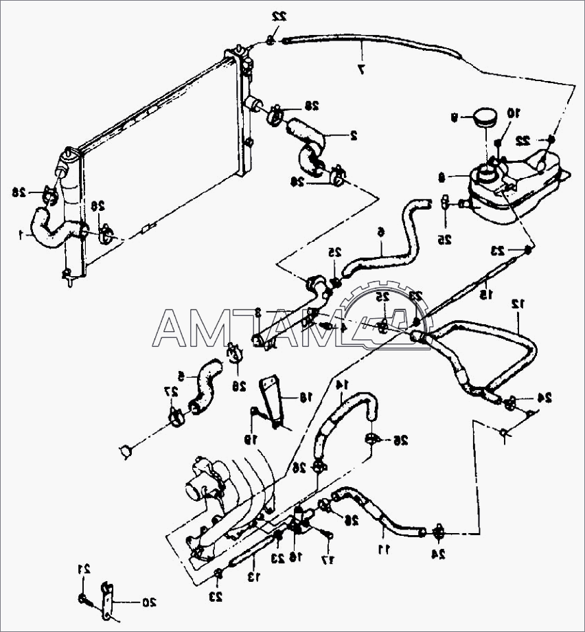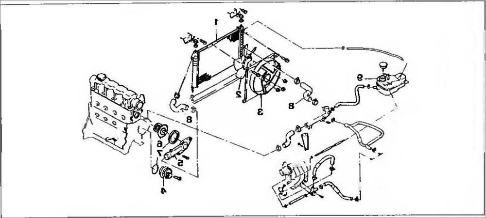 Узлы системы охлаждения двигателя A15SMS вид двигателя сзади: При этом вся жидкость циркулирует по рубашке охлаждения двигателя. Часть жидкости из рубашки охлаждения по шлангу, подсоединенному к патрубку головки блока, поступает в радиатор отопителя, а затем возвращается к насосу. В блок подогрева дроссельного узла жидкость поступает через шланг, подсоединенный к штуцеру корпуса термостата, а оттуда — в расширительный бачок и затем возвращается к насосу.