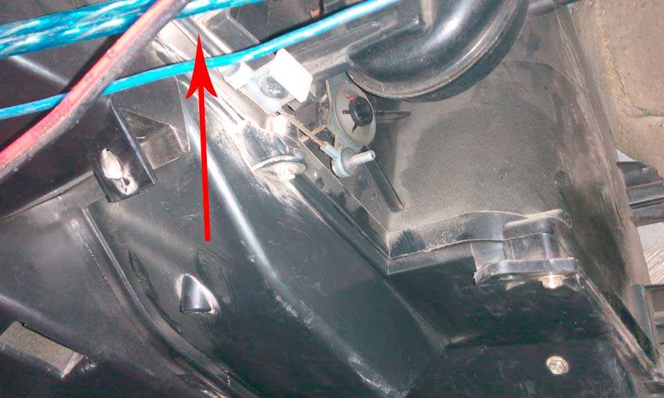 - Отсоедините тросик, идущий от блока. Находится он в районе левой ноги переднего пассажира. Для этого понадобиться крестообразная отвертка. Саморез откручиваем, тросик отводим вправо.